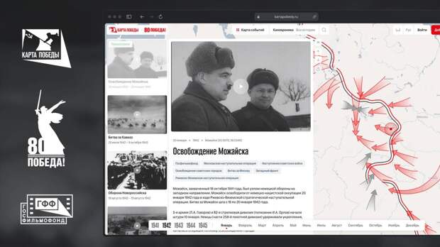 Госфильмофонд при поддержке Министерства культуры и в партнёрстве с Национальным центром исторической памяти и холдингом «МТС Медиа» представил интерактивный проект «Карта Победы». Он приурочен к 80-летию Победы и Году Защитника Отечества. Главный элемент ресурса — интерактивная карта с привязкой к событиям Великой Отечественной войны. Фото- и видеохроника синхронизированы с местами и временем съёмки. Пользователи смогут выбрать интересующую точку и временной отрезок, чтобы погрузиться в исторический контекст. На сайте проекта представлены уникальные архивные материалы из коллекции Госфильмофонда. В будущем к проекту смогут присоединиться и сами пользователи — достаточно зарегистрироваться и загрузить семейные документы времён войны.